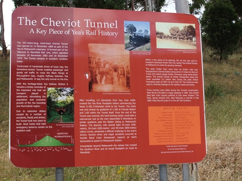 @ 38km Yea township – follow rail trail signs to a park and it begins again on the opposite side past the siding and shed, from here there is a gentle 9km hill to Cheviot tunnel